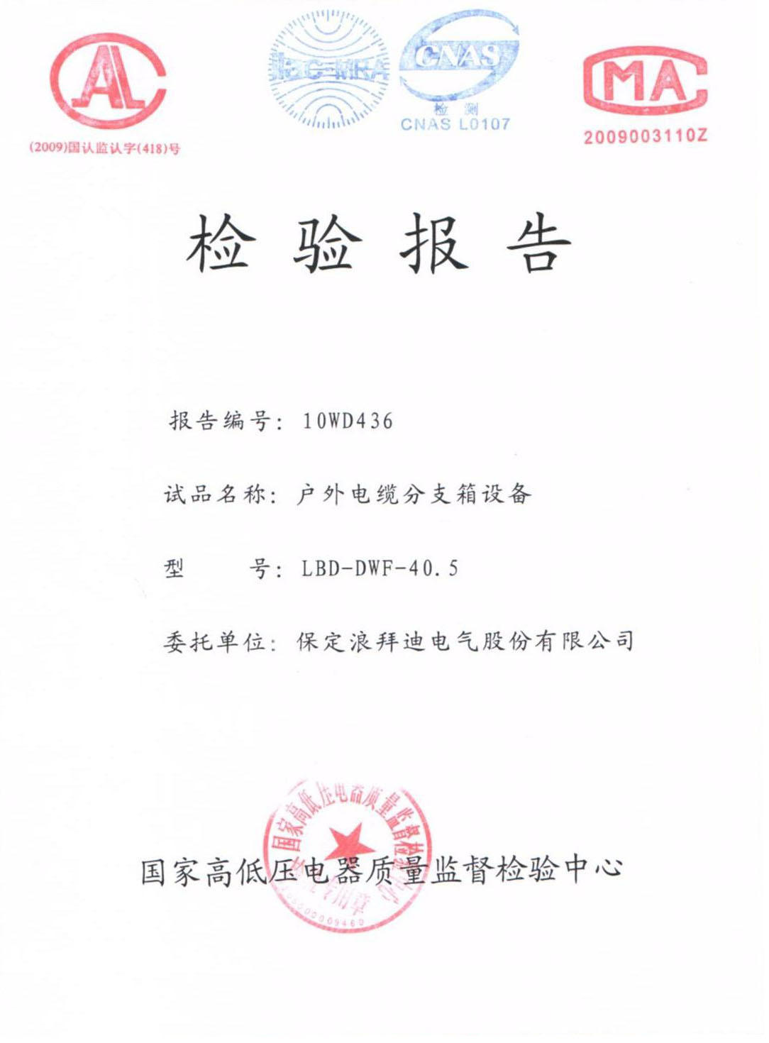 我公司户外电缆分支箱设备于2010年7月通过国家高低压电器质量监督检验中心检验。